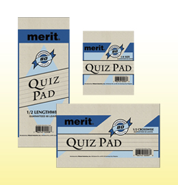 Item No. Description Size Case Pack 02007 1/2 Crosswise Pad 200mm X 125mm 200 02008 1/2 Lengthwise Pad 100mm X 250mm 200 02009 1/4 Quiz Pad 100mm X 125mm 400